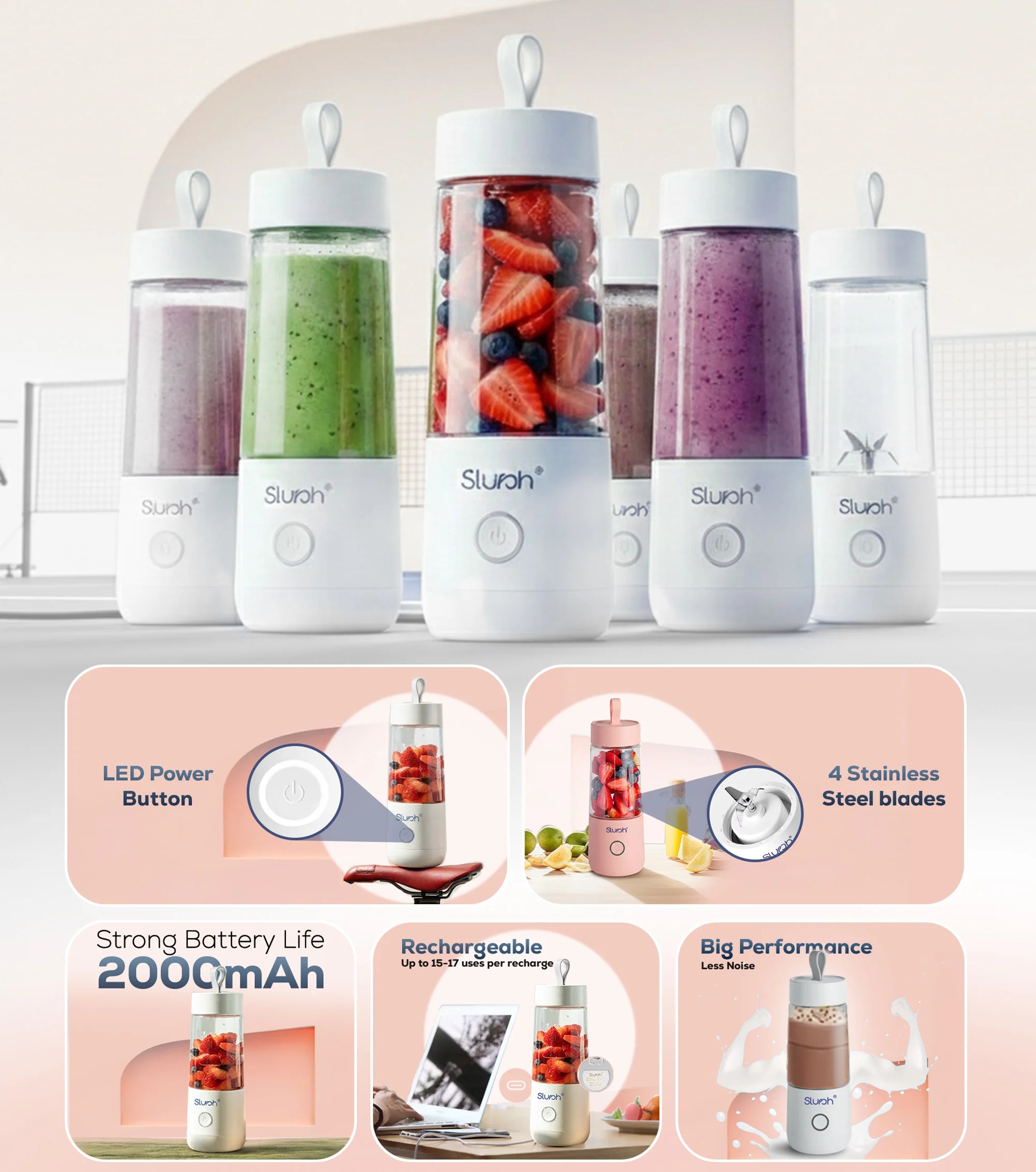 Once Slursh Bolt -350 ML Blender is fully charged, it is ready to make your favorite smoothies, juices and much more. You need to press and hold the power button, the White LED will blink 3 times and slurshing will begin. To stop, you need to press and release the power button again to stop.