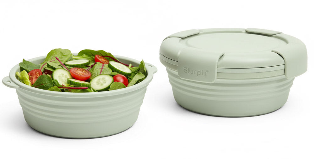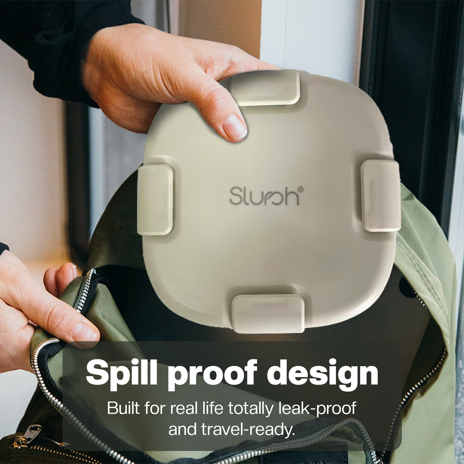 Traditional food storage wastes space and leaks frequently. Slursh collapses down, saving precious drawer and bag space without compromising meal capacity.