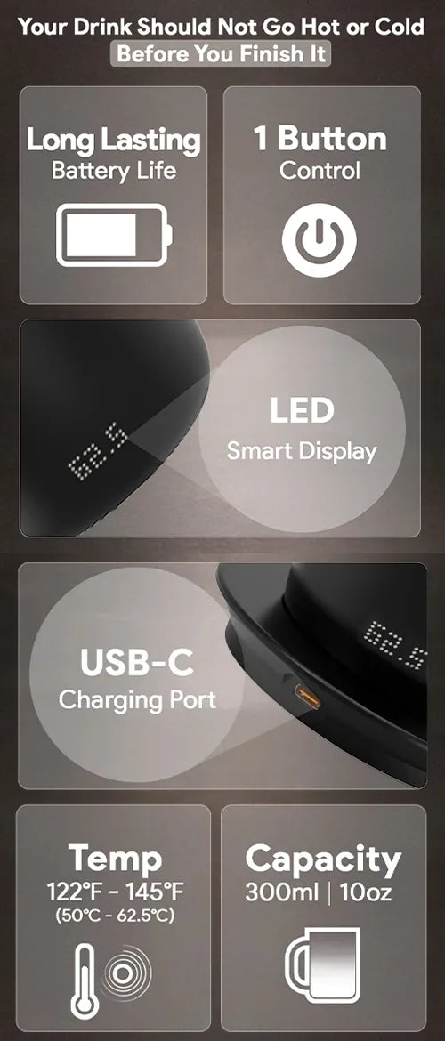 When placed on the charging coaster, it keeps drinks warm for hours at your selected temperature.